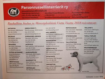Heute bekamen wir das neue Finska Kennelklubben Magazin "Koiramme" dort ist unser Billy abgebildet! Billys Foto wurde von Kaisa Suutari auf unserer Homepage entdeckt. Wir haben uns sehr gefreut, da das Bild als Weihnachtsgruß an die Finnischen Züchter im Magazin veröffentlicht wurde! Herzlichen Dank nochmal an Kaisa Suutari für die schöne Weihnachtskarte und das Jahrbuch vom Parsonrussellinterrierit ry. 1992 -2002, wirklich ein sehr schönes Buch mit vielen Fotos von alten bekannten Parsons incl. Ahnentafeln! Ein sehr schönes interessantes Weihnachtsgeschenk ;-) Meinen größten Dank jedoch an Hermann Kurz (PRTCD Kennel "vom Rossgumpen") der dieses tolle Standfoto von unserem Billy geknipst hat!!