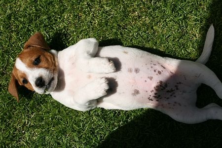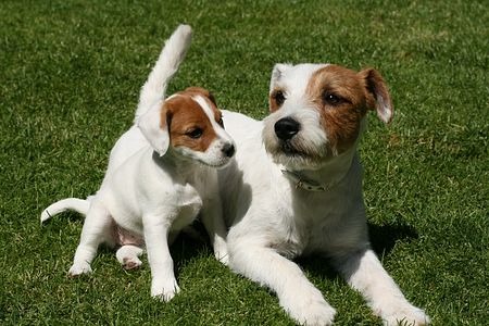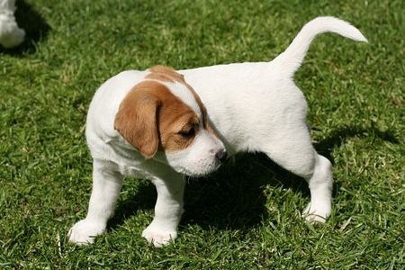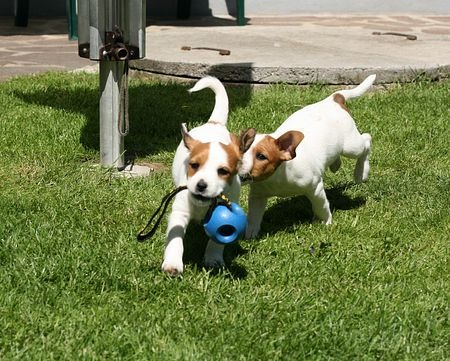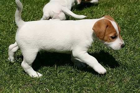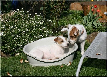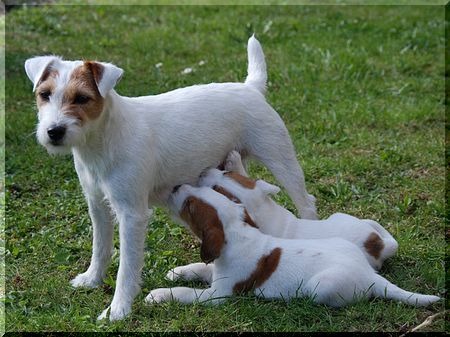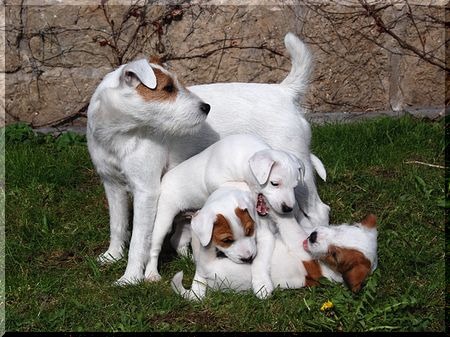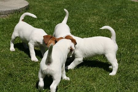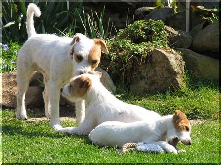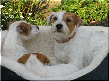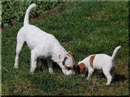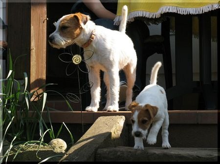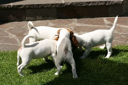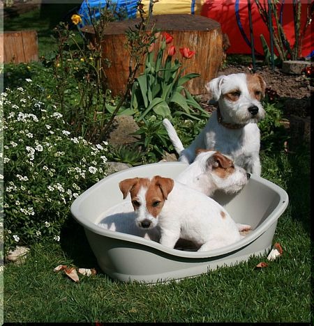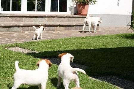 Diese Woche besuchten wir " Angel "die Tocher von Belie und Billy. Für unsere Russells war es ein erstes Familientreffen und auch alle Besitzer haben sich sehr gefreut, die kleine Hundefamilie vereint zu sehen! Papa Billy erfreute sich sehr, seine geliebte Belie wieder zu sehen. Die kleine Angel war sehr angetan und freute sich mit Papa Billy durch den Garten zu flitzen :-) Billy fühlte sich gleich als Familienoberhaupt und stand souverän im Hintergrund. Bei solchen zwei hübschen Mädels ist das auch kein Wunder. Es war ein wunderschönes Treffen an einem herrlichen Tag, der uns gerne in Erinnerung bleibt! Angel hat sich prächtig entwickelt, sie ist sehr feminin, hat ein tolles Gangwerk, ausgeprägtes Pigment, einen schönen Kopf und es macht wahnsinnig viel Freude, sie zu beobachten! Hier nun einige Bilder .........