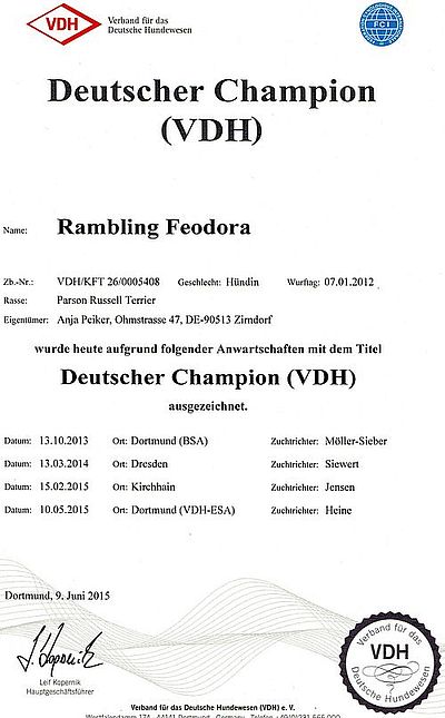 10.05.2015 Ausstellungsergebinsse: VDH-Europasiegerschau Dortmund Rambling Feodora "Funny" Championklasse V1,VDH, Res.CAC, Res.CACIB Unsere Funny hat somit die Bedingungen für den Dt. Champion VDH erfüllt!